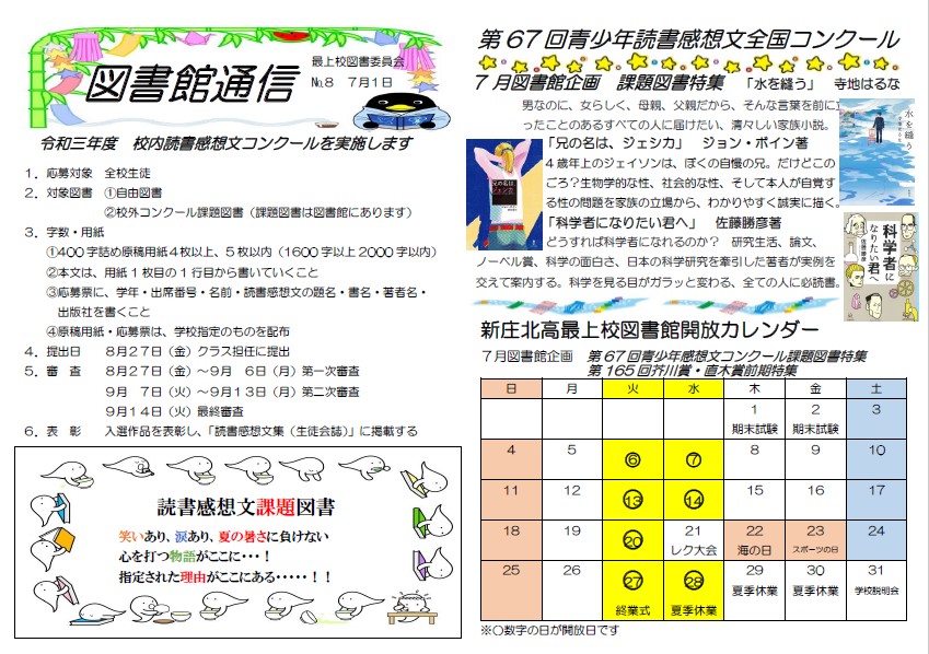 ・令和三年度校内読書感想文コンクールのお知らせ